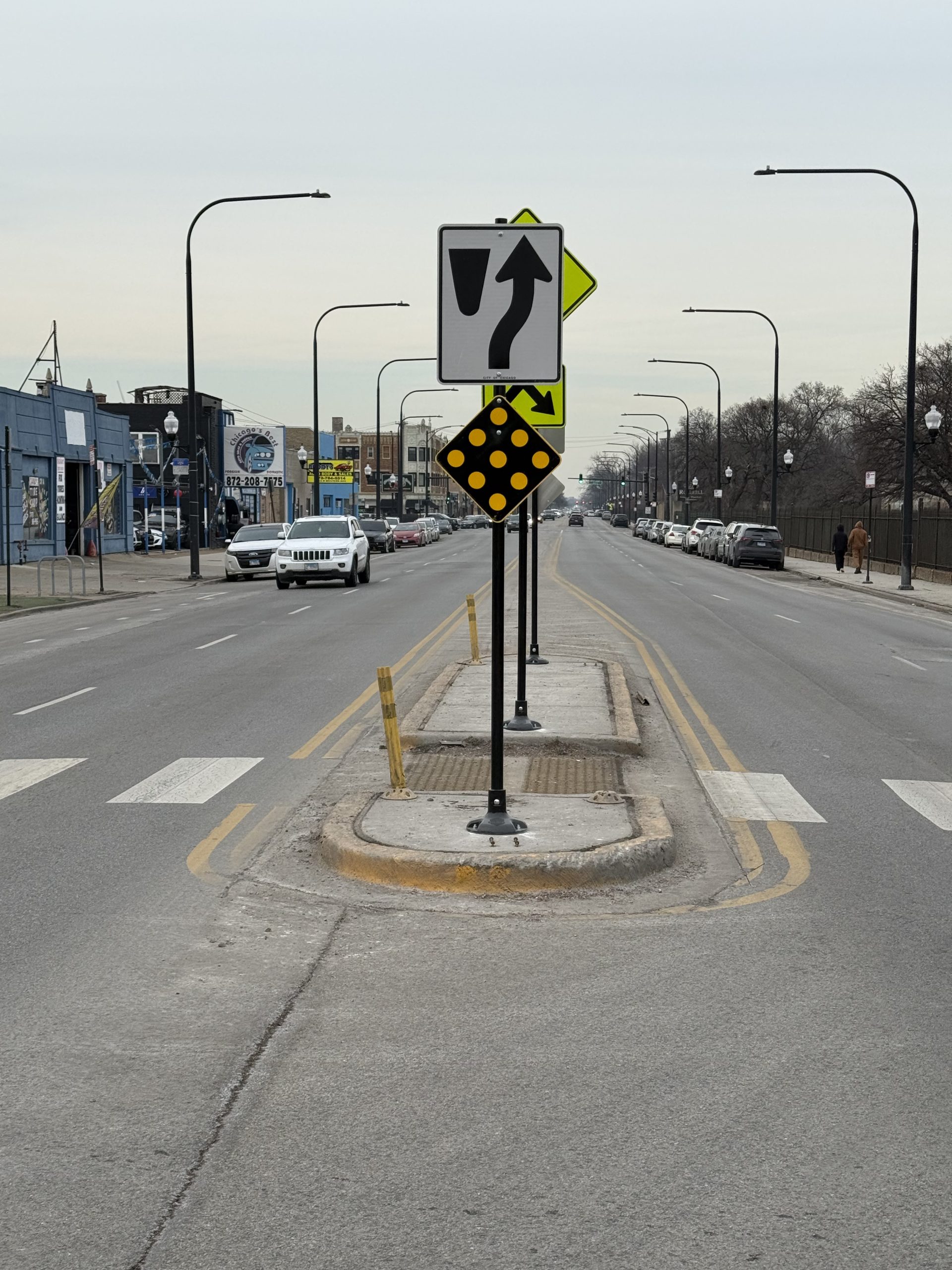 Across Chicago city planners have installed concrete bump-outs, pedestrian refuge islands, and protected bike lanes in the name of safety and traffic calming. While these features are designed to reduce pedestrian injuries and slow traffic, they can also pose serious dangers to motorists, especially when they are poorly marked, poorly lit, or difficult to see, especially at night. At night during a rain storm or snow storm with the glare of on coming traffic, they are remarkably easy to hit. I know from first hand experience since I hit the pedestrian island pictured above on the left at night during a rainstorm causing over $800 of damage to my car. The only difference being that when I hit it, the pedestrian island had no signage. The signage has been added recently probably as a result of complaints by drivers who rammed it.